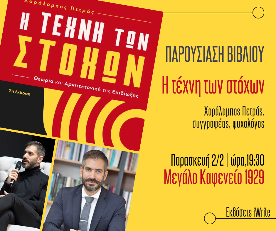 Ο Χαράλαμπος Πετράς, το Athens Coaching Institute και οι εκδόσεις iWrite, σας προσκαλούν την Παρασκευή 2 Φεβρουαρίου στις 19:30, στο Μεγάλο Καφενείο 1929, στην Άμφισσα, για την παρουσίαση του νέου του βιβλίο με τίτλο «HΤέχνη των Στόχων, Θεωρία & Αρχιτεκτονική της Επιδίωξης».